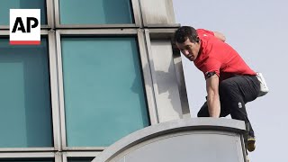 French urban climber Alain Robert scales newly-opened Taipei 101 in four hours during its grand opening week. Taiwan required him to use a rope.