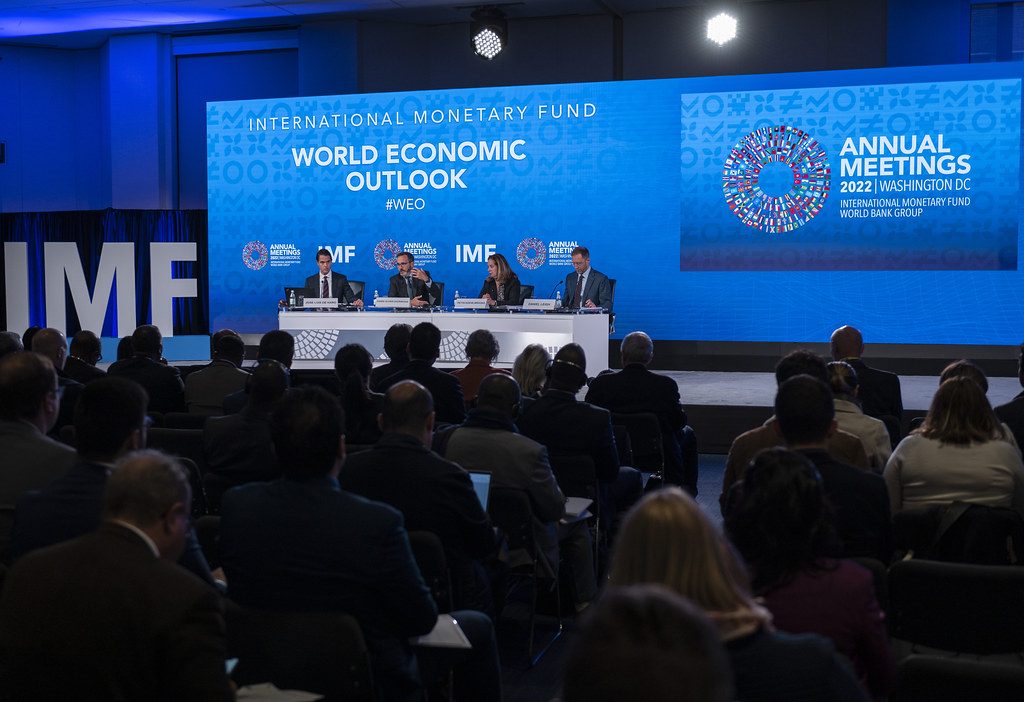 The IMF publishes the World Economic Outlook twice yearly with interim updates, providing the benchmark forecasts against which trade policy impacts are measured.