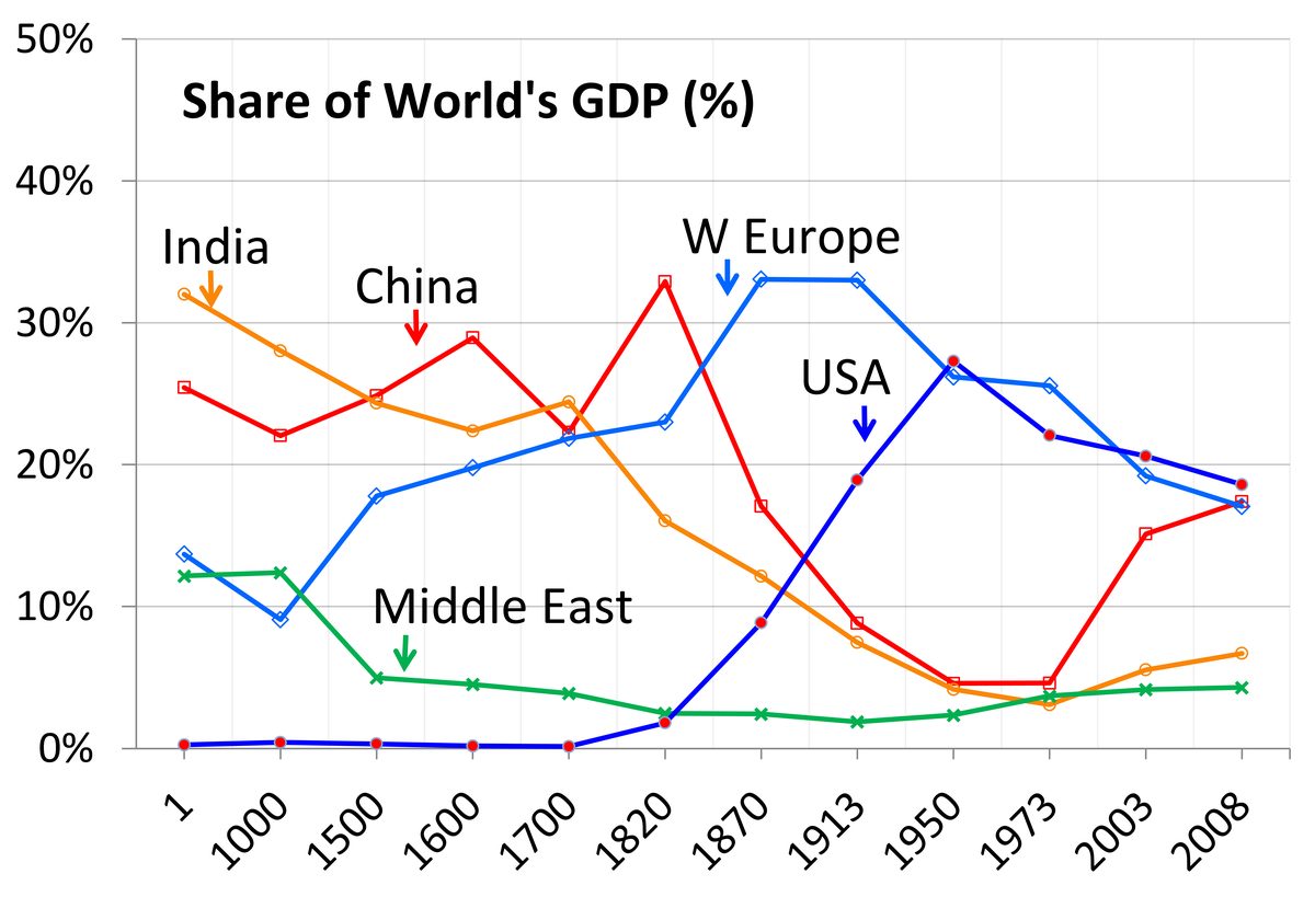 In 1750, China and India together produced roughly half of world output, and living standards in their prosperous regions roughly matched England's. By 1950, Western Europe and North America commanded the majority of global GDP, while China's share had fallen from 33% to under 5%. This 200-year separation of economic trajectories represents the largest divergence in human history.