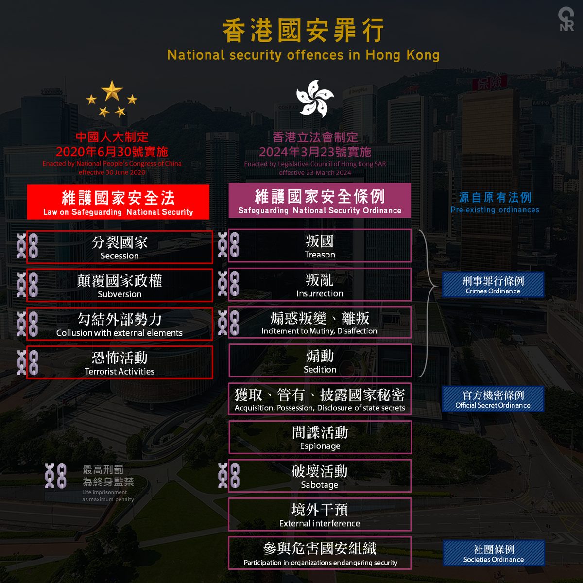 Hong Kong enacts its own domestic security legislation under Article 23 of the Basic Law, introducing new offenses including 'external interference' and crimes related to state secrets, with penalties up to life imprisonment.
