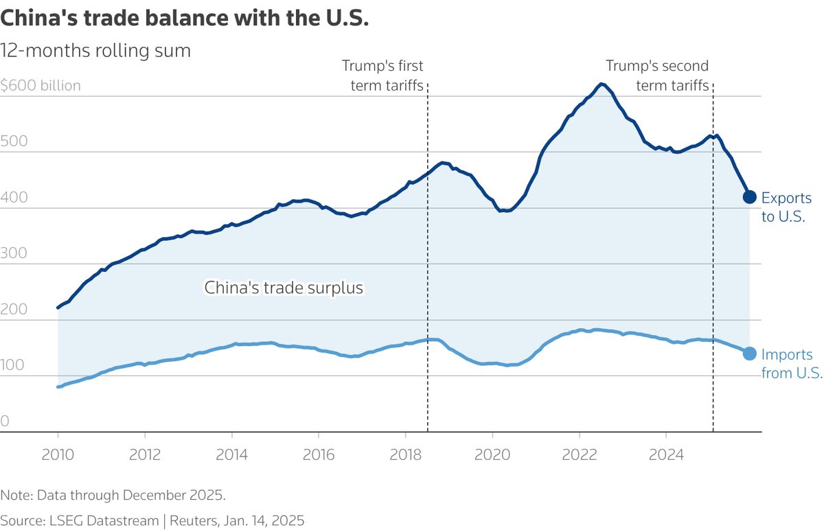 China posted a $1.2 trillion trade surplus for 2025—the largest any country has ever recorded. The number is roughly equivalent to the GDP of Indonesia, the world's 16th-largest economy. It comes after seven years of U.S. tariffs designed to shrink that very surplus, and eight days after Canada struck a deal with Beijing that slashed Chinese EV tariffs from 100% to 6.1%, marking a dramatic shift in Western trade policy toward China that prompted Trump to threaten 100% retaliatory tariffs on Canadian goods.
